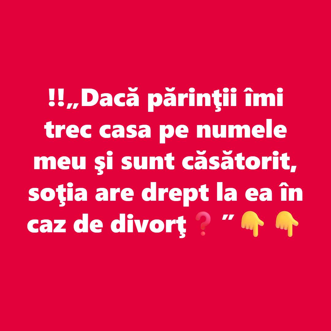 „Dacă părinții trec casa pe numele dumneavoastră printr-un contract de vânzare-cumpărare, atunci soția are drept, pentru că este bun comun dobândit în timpul căsătoriei”, a precizat avocatul.