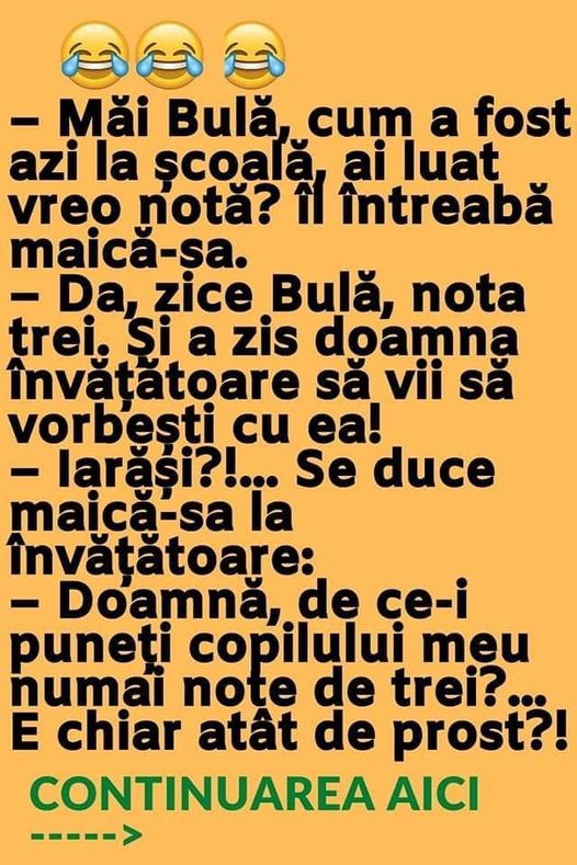 Măi Bulă, cum a fost azi la şcoală, ai luat vreo notă? îl întreabă maică-sa. – Da, zice Bulă, nota trei. Şi a zis doamna învăţătoare să vii să vorbeşti cu ea! – Iarăşi?!… Se duce maică-sa la învăţătoare: – Doamnă, de ce-i puneţi copilului meu numai note de trei?… E chiar atât de prost?! … Read more