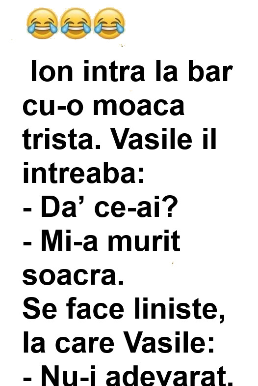 Ion intra la bar cu-o moaca trista. Vasile il intreaba: – Da’ ce-ai?– Mi-a murit soacra.Se face liniste, la care Vasile:– Nu-i adevarat, numa’ zice asa sa fim invidiosi. **Un vanator pleaca intr-un safari cu soacra-sa si su sotia. Intr-o seara prin jungla soacra se rataceste si vanatorul si sotia pleaca sa o caute. Intr-un … Read more