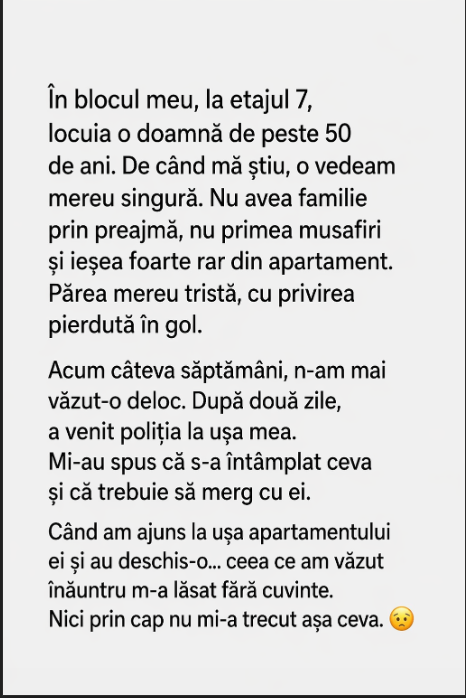 O femeie a locuit la etajul 8 al blocului meu timp de 50 de ani.